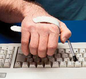The staple of the typical office workspace is the computer. Using a keyboard can challenging if you have limited finger strength or hand control. The Typing Aid can help you press keys accurately. The clip fits around the hand and and provides a small, stable, pointer with a rubber tip for pressing keys. It can be used on keyboards, calculators, telephones, and other machines with keys and buttons. The rubber tip ensures that it will not damage machine keys.